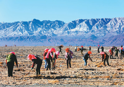 日前,造林人员在祁连山下的甘肃省张掖市甘州区文冠果国家储备林基地进行栽植作业。