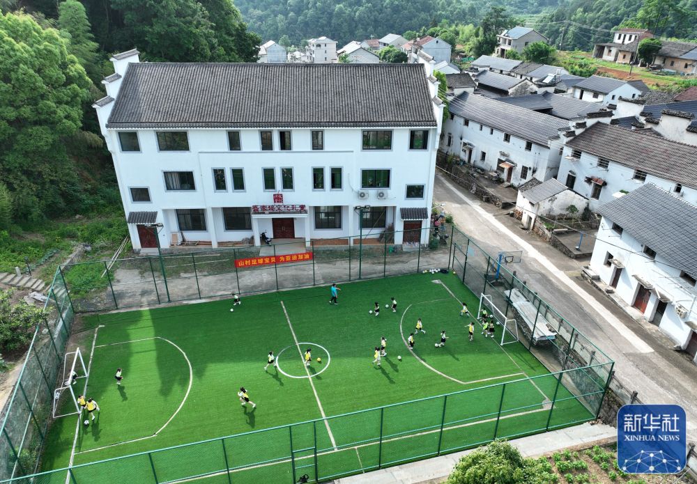小学生在浙江诸暨市浬浦镇一座乡贤捐资兴建的足球场内踢球(5月25日摄)。新华社记者 翁忻旸 摄