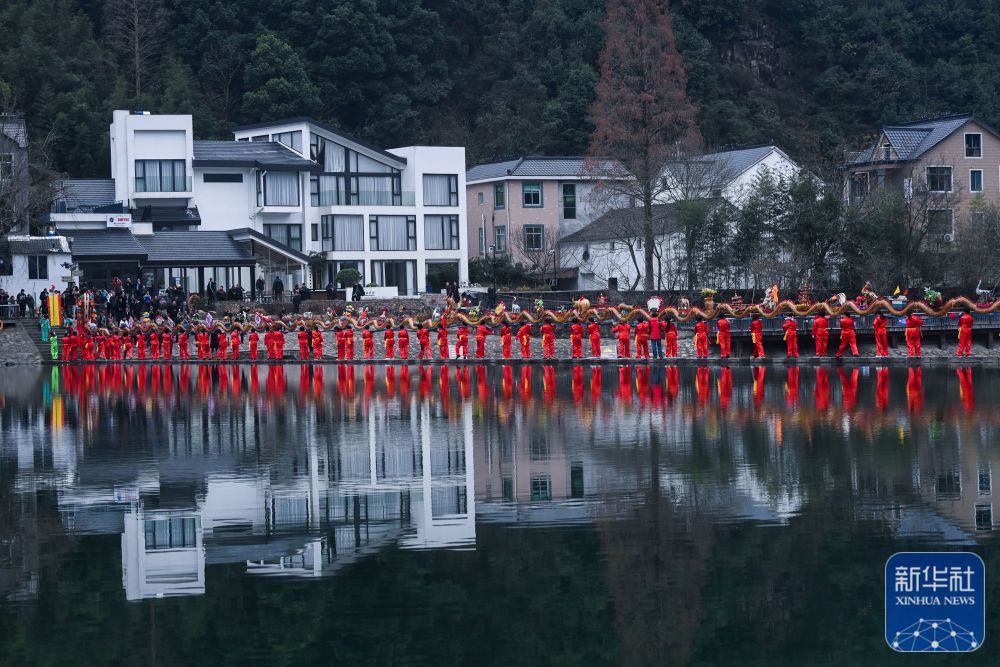 浙江杭州市富阳区湖源乡窈口村女子板龙队在进行板凳龙舞龙表演(2月1日摄)。湖源乡是个群山环抱、青山绿水、生态秀美的山区乡镇,近年来,湖源紧抓机遇,围绕“乐水湖源、龙鳞+”发展目标,立足山水特色,锚定发展绿色经济,打造独具特色的乡村旅游品牌。新华社记者 徐昱 摄