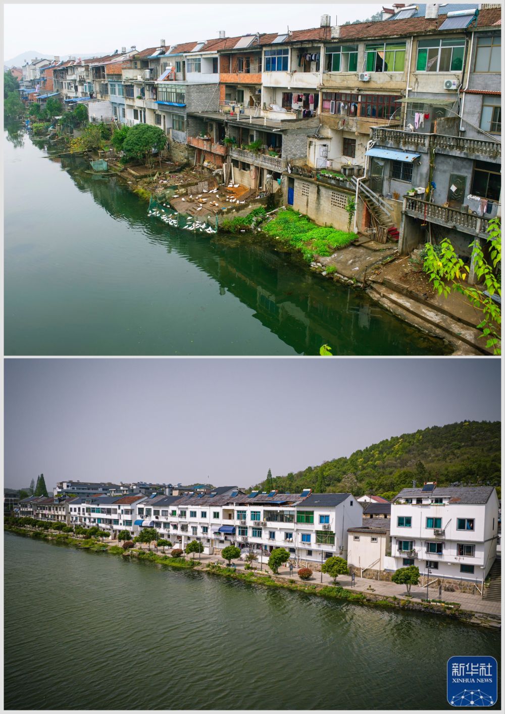 拼版照片:上图为浙江诸暨市暨南街道街亭村开化江畔的民居(2013年11月13日摄);下图为村容村貌提升后暨南街道街亭村开化江畔民居新貌(无人机照片,2023年4月12日摄)。新华社记者 江汉 摄