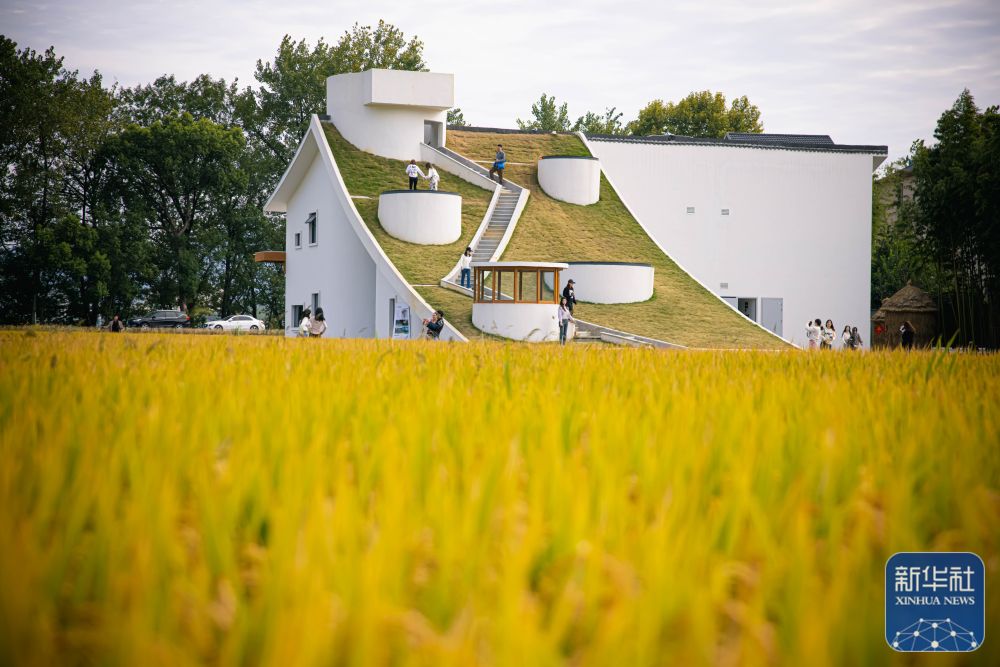 这是浙江杭州市桐庐县桐君街道梅蓉村金黄的稻田与乡村会客厅(2022年10月25日摄)。新华社记者 江汉 摄