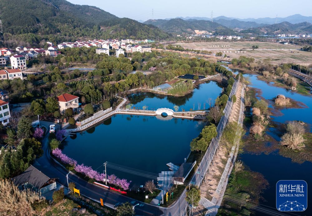 空中俯瞰浙江金华市金东区岭下镇八仙溪及周边村庄(3月14日摄,无人机照片)。近年来,岭下镇通过“抓源头、强整治、做项目、重长效”的治理思路,先后关停八仙溪沿岸多家制砂企业及养殖场,清理河道垃圾,完成28个村农村生活污水处理工程和51口池塘清淤,2018年以来八仙溪水质常年保持在Ⅱ类以上。新华社记者 徐昱 摄