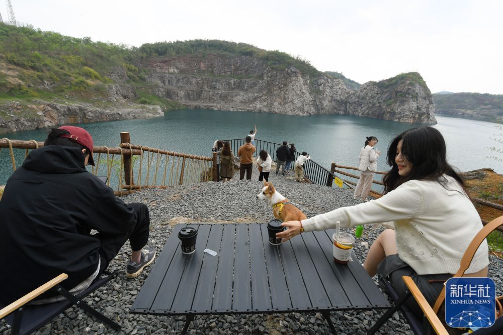 游客在浙江湖州市安吉县梅溪镇红庙村一家建于废弃矿坑旁的咖啡馆休闲(4月7日摄)。新华社记者 翁忻旸 摄