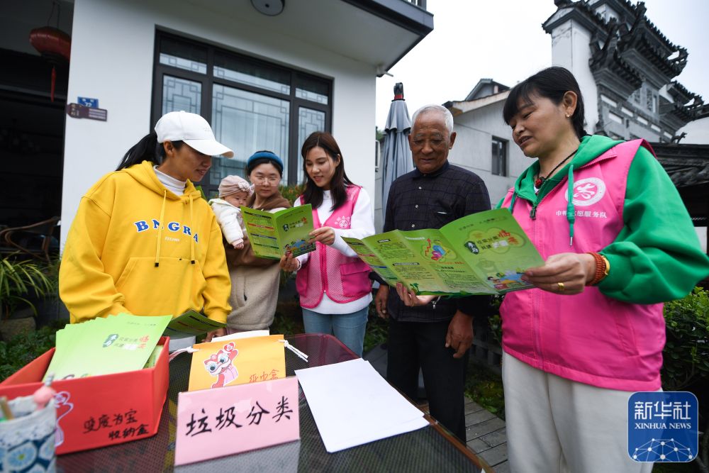 浙江杭州市临安区湍口镇妇联组织党员志愿者在庭院里给村民普及垃圾分类知识,并介绍如何变废为宝,用废旧物品美化环境(2022年4月14日摄)。新华社记者 徐昱 摄