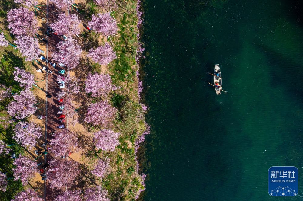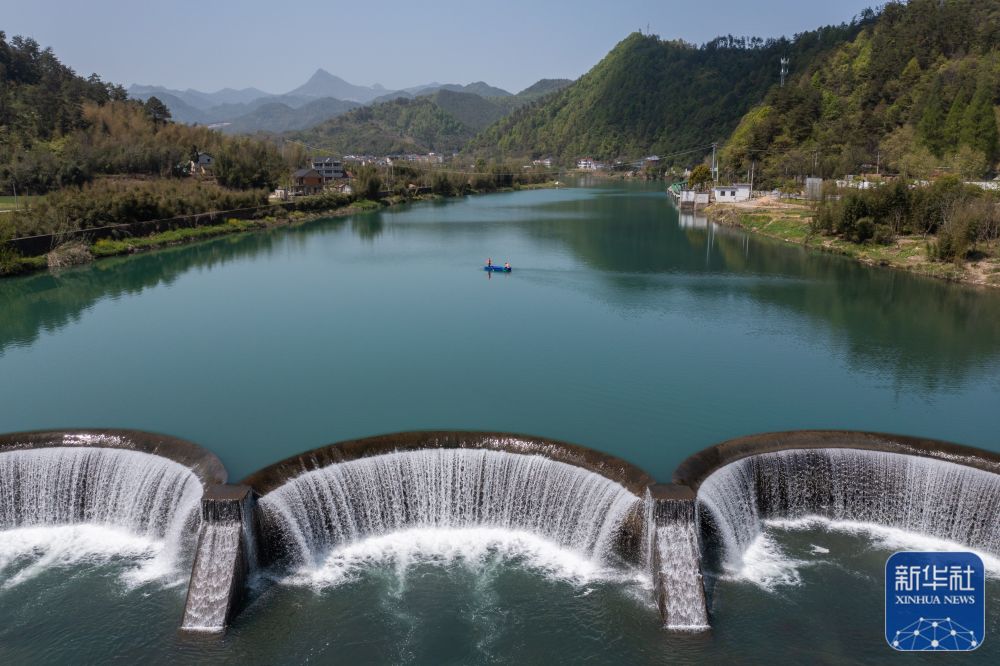 在浙江金华市浦江县浦阳江同乐段,工作人员乘船在打捞水面漂浮物(3月14日摄,无人机照片)。当地通过生态治理、河湖清淤、景观改造、种植水生植物等综合整治措施,造就浦阳江畔春有樱花落英、秋有杉叶火红的四季美景,满足群众赏景及亲水需求。浦阳江也成功创建为“浙江省美丽河湖”。新华社记者 徐昱 摄