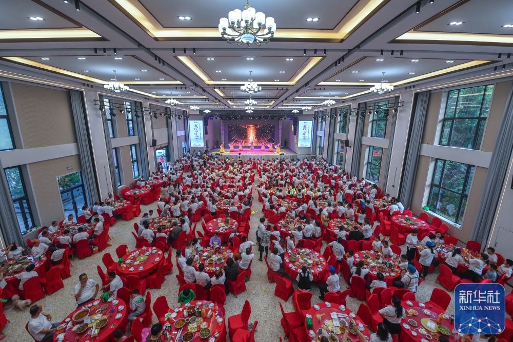 浙江建德市新安江街道梅坪村村民在村文化礼堂内参加百家宴并观看文艺演出(5月27日摄)。新华社记者 徐昱 摄