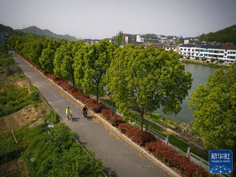 村民在浙江诸暨市暨南街道街亭村开化江畔的绿道上骑行(4月12日摄,无人机照片)。新华社记者 江汉 摄