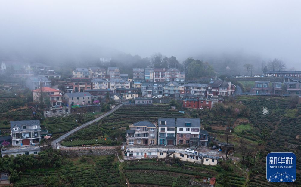 空中俯瞰云雾中的浙江杭州富阳里山镇安顶村(3月23日摄,无人机照片)。安顶村海拔700多米,一年中有200多天可观赏“安顶云海”奇景,当地百姓依托高山云雾茶以及特色乡村旅游产业,走出了一条茶旅融合的新农村共同富裕发展模式。新华社记者 徐昱 摄