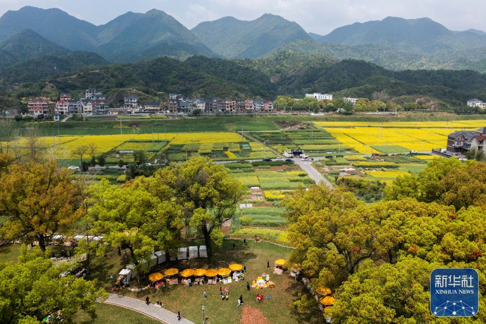 空中俯瞰浙江杭州市富阳区新桐乡小桐洲村香樟公园和盛开的油菜花田(4月7日摄,无人机照片)。新桐乡依托近万亩盛开的油菜花田和美丽的富春江风景,开展特色乡村文旅活动,做好美丽乡村、美丽经济的文章,助力乡村振兴。新华社记者 徐昱 摄