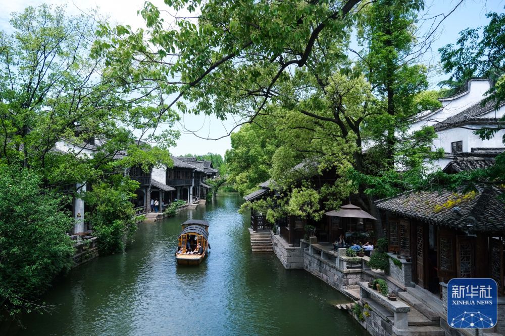 游客乘船在浙江嘉兴桐乡市濮院镇的濮院时尚古镇游览(5月2日摄)。濮院时尚古镇以“历史街区再利用”的概念经过10年的升级改造而成,拥有典型的江南水乡地貌特征,成功创建为浙江省级5A级景区镇。新华社记者 徐昱 摄